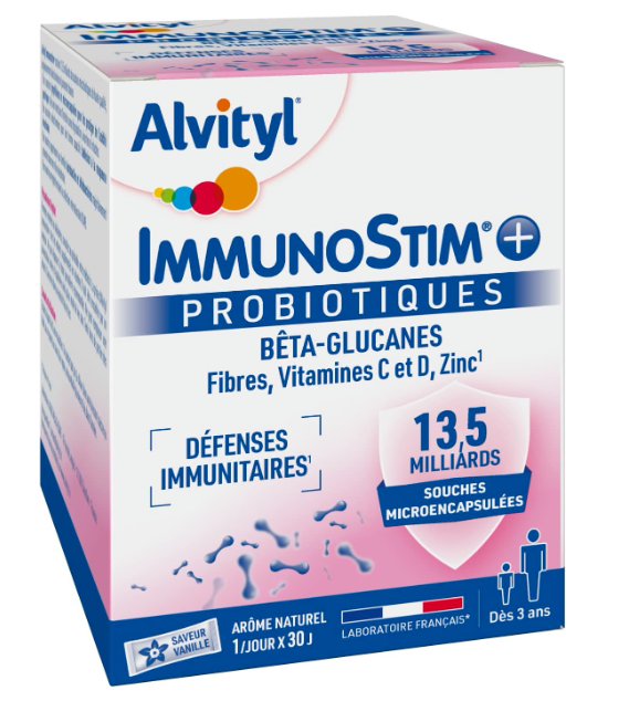 Alvityl Enfant Immunostim+ est un complément spécialement formulé pour renforcer les défenses naturelles chez les enfants dès 3 ans. Grâce à un mélange de probiotiques très dosés, de vitamines essentielles comme la D et la C, et de zinc, ce produit aide à soutenir le système immunitaire, à apaiser les périodes de fatigue, et à maintenir un microbiote équilibré. Son goût fraise naturel et sa formule facile à utiliser le rendent particulièrement adapté aux enfants, pour un soutien bien-être quotidien ou en cure lors des saisons plus exigeantes.