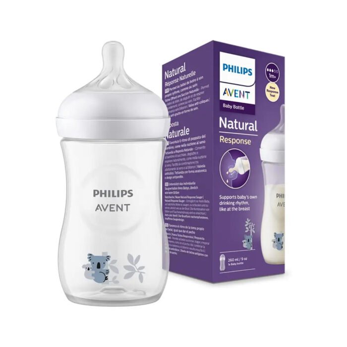 Le biberon Avent Natural Response 260 ml version plastique, avec motifs « Giraffe » ou « Koala », est conçu pour offrir une expérience d’alimentation douce et naturelle. Sa tétine de style « Natural » permet au bébé de boire à son rythme — le lait ne sort que lorsque l’enfant tète — ce qui facilite la transition entre allaitement et biberon. Grâce à sa forme ergonomique, il se tient facilement, même à un angle, et son plastique sans BPA assure sécurité et légèreté.