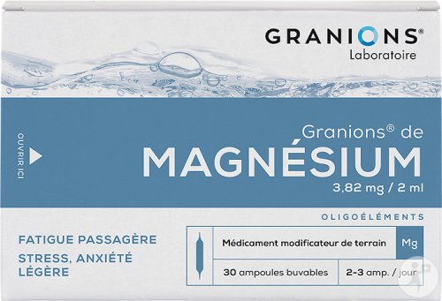 Granions de Magnésium est un complément alimentaire conçu pour aider à maintenir un bon équilibre musculaire, nerveux et énergétique au quotidien. Le magnésium contribue au fonctionnement normal du système nerveux, à la réduction de la fatigue et à la santé musculaire, favorisant détente et confort, notamment lors des périodes de stress, de surmenage ou d’efforts physiques. Facile à intégrer dans une routine bien-être, il se prend généralement en une gélule par jour avec un grand verre d’eau, pour une cure simple et efficace.